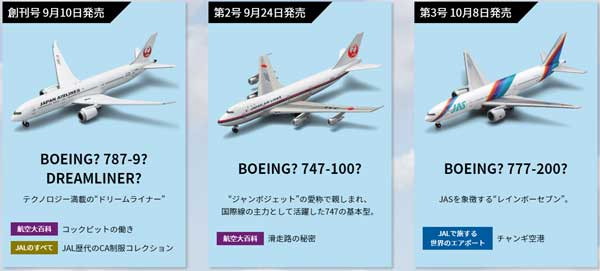付属するダイキャスト製モデルは、創刊号がドリームライナー、第2号がジャンボジェットなど。